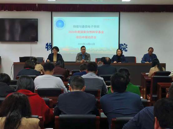 2025年10月21日下午,物理与通信电子学院在学院大会议室召开2026年国家自然科学基金申报动员大会。理电学院院长胡利云及学院领导班子成员、各科研团队负责人及拟申报教师近100人参会。会议由理电学院分管副院长骆兴芳主持。
