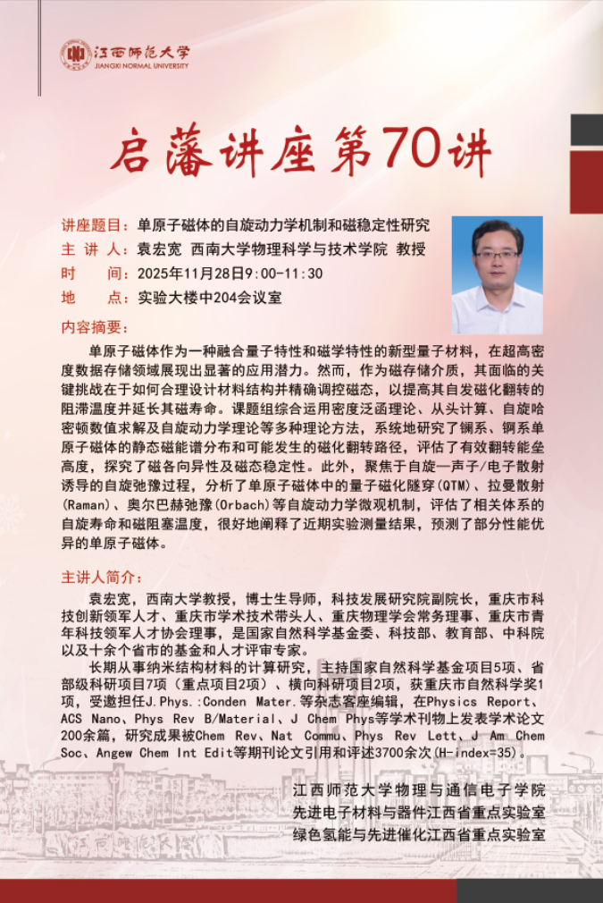 启藩讲座第70讲:单原子磁体的自旋动力学机制和磁稳定性研究