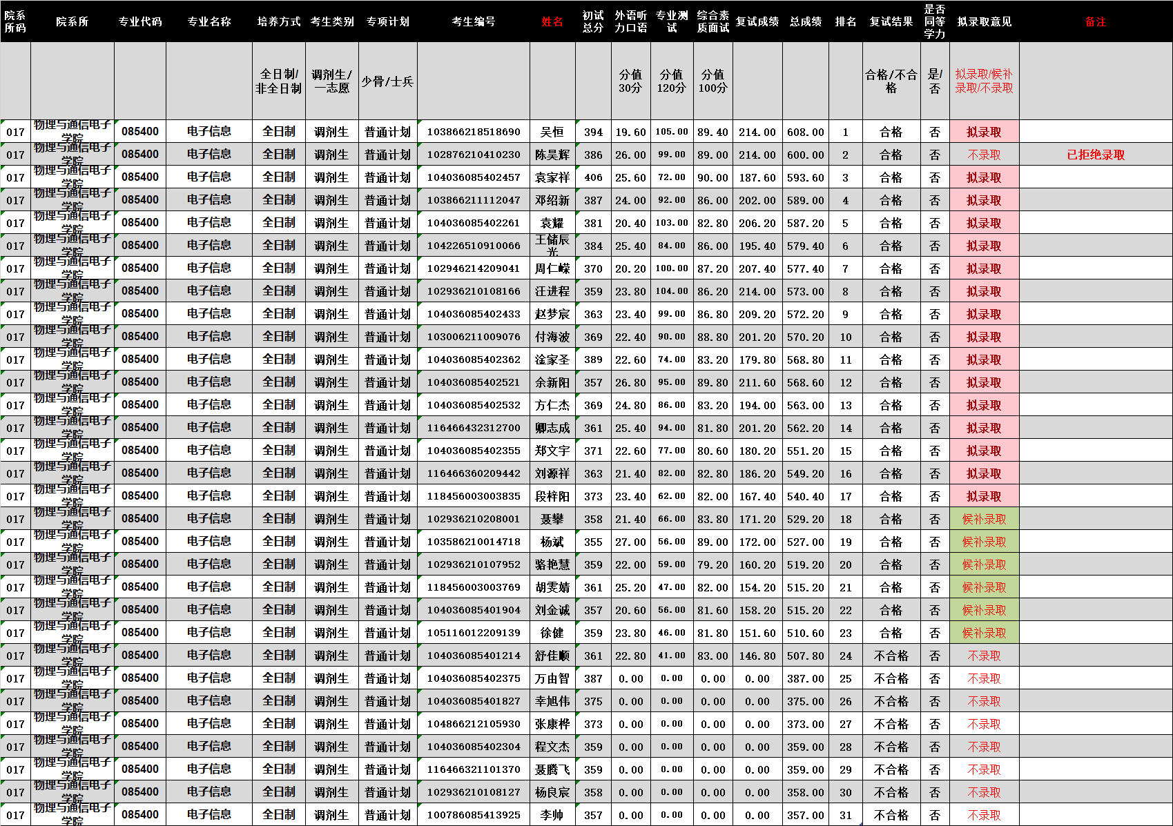 物理与通信电子学院2026年硕士研究生电子信息专业调剂复试结果公示