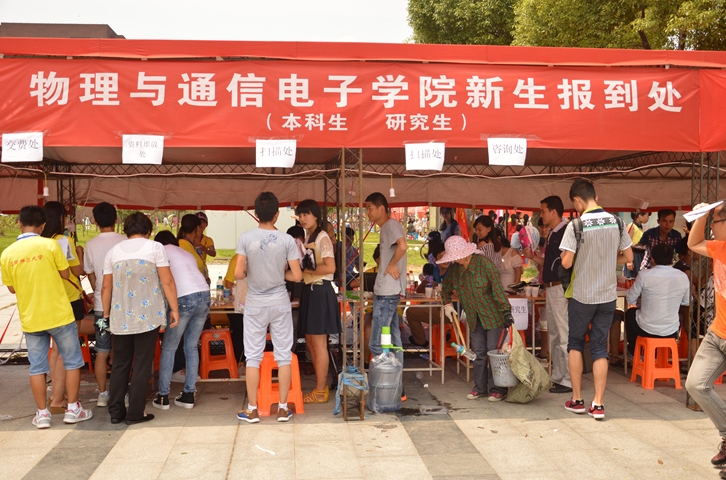 根据学校传统,本次迎新活动也是以学院为单位,在图文信息中心门口设立迎新点。理电学院的志愿者们来自学院的各个组织,同学们分工明确,有条不紊地进行着志愿服务。先是由专人负责举牌,方便新生找到所属学院的站点,再由负责领路的同学带领他们按照规定的步骤到指定地点办理保险、领取钥匙等。待一切交接手续办齐后,负责领路的同学便会将新生及其家属送到宿舍。艳阳高照,酷热难挡,但同学们都认真地履行着自己的职责,忙碌而年轻的身影穿梭在整个校园。
