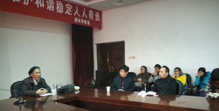 2014年12月3日下午3:00,理电学院在X1204举办了一场“教学月”活动——专家座谈会,特邀原省政府参事、省政协委员、理电学院院长雷敏生教授与2014级物理学专业学生座谈。座谈会由院党委书记胡弢主持,院党委副书记袁建生及各年级辅导员列席。