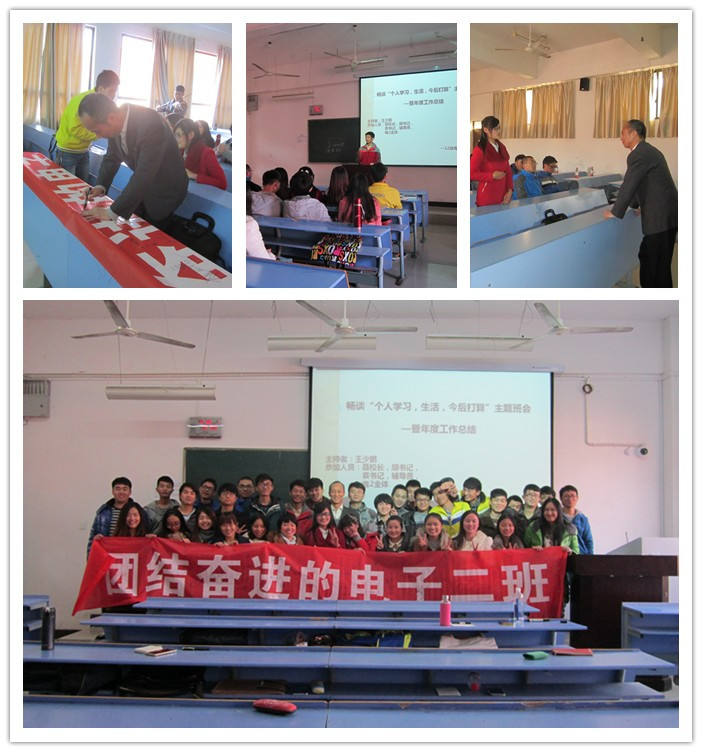 此次班会由班长王少鹏主持。他首先从“学习、纪律、获奖、活动、入党”五个方面对班级年度工作进行了总结汇报,并特别强调了“全面发展”这个概念,鼓励大家在学好专业课的同时积极参予各项活动。接下来,部分学生代表就班会的主题,从学习、生活及今后打算等方面,与同学们一道分享了各自的收获及对未来的憧憬。团支书张文静以“考不考研”为主要话题与同学们进行了交流;学习委员祝天培则侧重于“日常的学习”与大家分享了自己的经验;其他学生代表邹泽琼、尹文兵、赵宇豪一一讲述了自己在这一年学习、生活的情况及未来规划;心理委员温灏以“拒绝拖延症”为主要内容,对同学们的学习规划提出了建议。