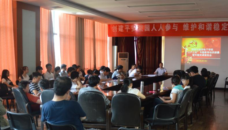 为贯彻落实中央、省委及学校关于“三严三实”专题教育的部署与要求, 6月12日下午,物理与通信电子学院在先骕楼1204学院大会议室举行“三严三实”专题教育动员大会,学院党委书记胡弢作了动员部署并作专题党课,纪委吴金淼同志莅会指导。学院领导班子、副科以上干部、全体教工党员及学生党员代表参加了会议。会议由院党委副书记袁建生主持。