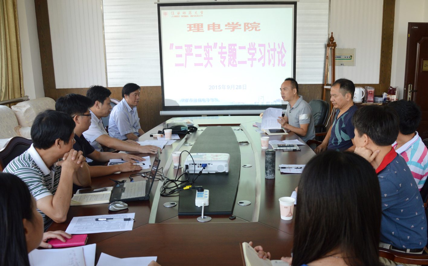 9月28日下午,物理与通信电子学院在学院小会议室召开集中学习会议,围绕“严以律己,严守党的政治纪律和政治规矩,自觉做政治上的‘明白人’”的主题,开展“三严三实”专题教育第二专题的第一次学习研讨。