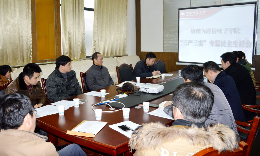 根据学校的部署和要求,1月20日下午,物理与通信电子学院在学院小会议室召开“三严三实”专题民主生活会,校党委副书记聂剑莅会指导并作讲话。组织部相关负责人、学院党政班子全体成员参加会议,部分教职工代表列席会议。